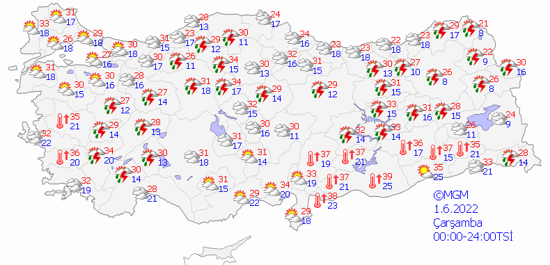 Meteoroloji Genel Müdürlüğü tarafından yapılan son değerlendirmelere göre: İç Ege, Göller yöresi, İç Anadolu'nun kuzeyi, Batı ve Doğu Karadeniz'in iç kesimleri, Doğu Anadolu'nun kuzey ve batısı ile Van'ın doğusu ve Hakkari çevrelerinin kısa süreli ve yerel olmak üzere sağanak ve gök gürültülü sağanak yağışlı geçeceği tahmin ediliyor.