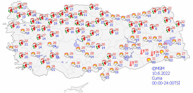 Meteoroloji Genel Müdürlüğü tarafından yapılan son değerlendirmelere göre: Marmara'nın doğusu, Doğu Akdeniz'in iç kesimleri, İç Anadolu'nun kuzey ve doğusu, Batı Karadeniz, Orta ve Doğu Karadeniz'in iç kesimleri, Doğu Anadolu'nun kuzeyi ile Edirne, Kırklareli, Tekirdağ, Çanakkale, Kütahya, Isparta, Burdur, Samsun ve Malatya çevrelerinin yerel olmak üzere sağanak ve gök gürültülü sağanak yağışlı geçeceği tahmin ediliyor. Yağışların öğle saatlerinden sonra Edirne, Kırklareli, Karabük, Kastamonu, Çankırı, Çorum çevreleri ile Bolu'nun doğusunun kısa süreli ve yerel olmak üzere kuvvetli olması bekleniyor.
