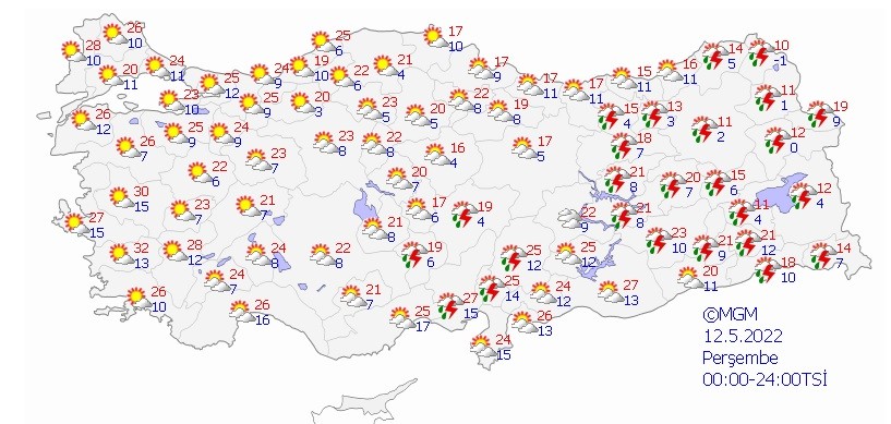 Meteoroloji Genel Müdürlüğü tarafından yapılan son değerlendirmelere göre: Ülkemizin güney, iç ve doğu kesimlerinin parçalı yer yer çok bulutlu, Doğu Karadeniz'in iç kesimleri, Doğu Akdeniz'in doğusu, Malatya dışında Doğu Anadolu bölge geneli, Güneydoğu Anadolu'nun doğusu, Kayseri ve Niğde çevreleri ile bu akşam saatlerinde Güney Ege'nin iç kesimleri, Batı Akdeniz'in iç kesimleri, Tokat, Şanlıurfa, Mardin, Diyarbakır, Konya, Karaman, Ankara'nın güneyi, Çubuk, Akyurt, Esenboğa çevreleri ve Doğu Akdeniz'in iç kesimlerinin yerel olmak üzere sağanak ve gök gürültülü sağanak yağışlı, diğer yerlerin az bulutlu ve açık geçeceği tahmin ediliyor.