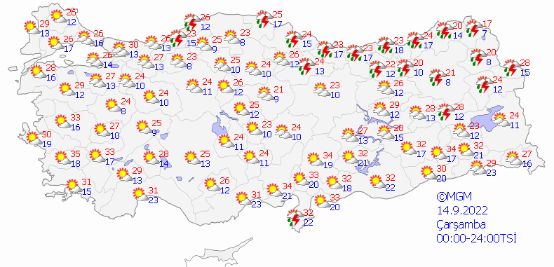Meteoroloji Genel Müdürlüğü tarafından yapılan son değerlendirmelere göre: Ülkemizin kuzey, iç ve doğu kesimlerinin parçalı ve yer yer çok bulutlu, Doğu Akdeniz, Batı Karadeniz, Orta Karadeniz kıyıları, Doğu Karadeniz, Doğu Anadolu'nun kuzey ve batısı ile Tokat çevrelerinin yerel sağanak ve gök gürültülü sağanak yağışlı, diğer yerlerin parçalı ve az bulutlu geçeceği tahmin ediliyor. Yağışların, Orta ve Doğu Karadeniz kıyıları ile Doğu Akdeniz'de yerel kuvvetli olması bekleniyor.