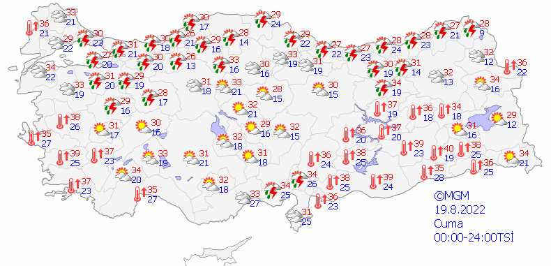 Meteoroloji Genel Müdürlüğü tarafından yapılan son değerlendirmelere göre; Ülkemizin kuzey ve iç kesimlerinin parçalı yer yer çok bulutlu, Marmara'nın doğusu, Batı Karadeniz, Akdeniz'in Toroslar mevkii, Osmaniye, Kahramanmaraş'ın güneybatısı, Orta Karadeniz kıyıları ve Doğu Karadeniz ile Eskişehir, Çankırı, Ankara'nın kuzeybatı çevreleri, Kütahya, Erzincan, Ardahan ve Erzurum'un kuzeyinin yerel olmak üzere sağanak ve gök gürültülü sağanak yağışlı, diğer yerlerin az bulutlu ve açık geçeceği tahmin ediliyor.