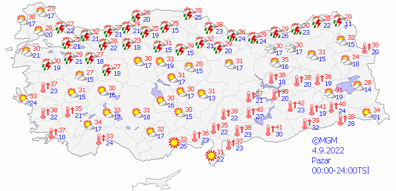 Meteoroloji Genel Müdürlüğü tarafından yapılan son değerlendirmelere göre: Ülkemizin kuzey ve batı kesimlerinin parçalı, yer yer çok bulutlu, Marmara, Batı Karadeniz'in iç kesimleri, Sinop, Muğla'nın iç kesimleri, Aydın'ın doğusu ve Denizli'nin batı çevreleri ile bu akşam saatlerinde Kütahya, Tokat, Trabzon çevrelerinin yerel sağanak ve gök gürültülü sağanak yağışlı, diğer yerlerin az bulutlu ve açık geçeceği tahmin ediliyor.