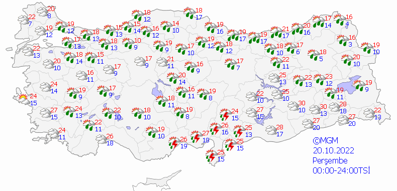Meteoroloji Genel Müdürlüğü tarafından yapılan son değerlendirmelere göre: Ülkemiz genelinin parçalı ve yer yer çok bulutlu, Marmara’nın doğusu, Batı Akdeniz’in iç kesimleri, Doğu Akdeniz, İç Anadolu’nun güney ve doğusu, Karadeniz, Doğu Anadolu’nun kuzey ve batısı ile Afyonkarahisar, Denizli, Uşak, Kütahya, Eskişehir, Çankırı, Bitlis, Muş, Bingöl, Gaziantep, Kilis, Diyarbakır, Batman, Siirt çevreleri ve Şanlıurfa'nın kuzey ilçelerinin sağanak ve yer yer gök gürültülü sağanak yağışlı geçeceği tahmin ediliyor. Yağışların Doğu Karadeniz kıyıları ile Samsun’un doğusu, Ordu ve Artvin çevreleri ile gece saatlerinden sonra Diyarbakır ve Batman'ın kuzey kesimlerinde kuvvetli ve yer yer çok kuvvetli olması bekleniyor. Rüzgarın: Doğu Anadolu’nun doğusunda güney ve güneybatı yönlerden yer yer kuvvetli ve kısa süreli fırtına (40-80 km/saat) şeklinde esmesi bekleniyor.