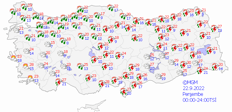 Yapılan son değerlendirmelere göre; ülkemiz genelinin parçalı ve çok bulutlu, Marmara, Karadeniz, İç Anadolu, Orta ve Doğu Akdeniz, Doğu Anadolu ile Antalya, Gaziantep, Kilis, Batman ve Siirt çevrelerinin aralıklı sağanak ve gök gürültülü sağanak yağışlı geçeceği tahmin ediliyor. Yağışların; Marmara'nın doğusu, Karadeniz kıyıları, Kastamonu, Tokat, Gümüşhane, Bayburt, Sivas ve Osmaniye çevreleri ile Kırıkkale'nin kıyı kesimleri, Yozgat ve Kayseri'nin doğu ilçeleri, Adana'nın kuzey ve doğusu, Hatay kıyıları ve Kahramanmaraş'ın batı kesimlerinde yerel kuvvetli olması bekleniyor.