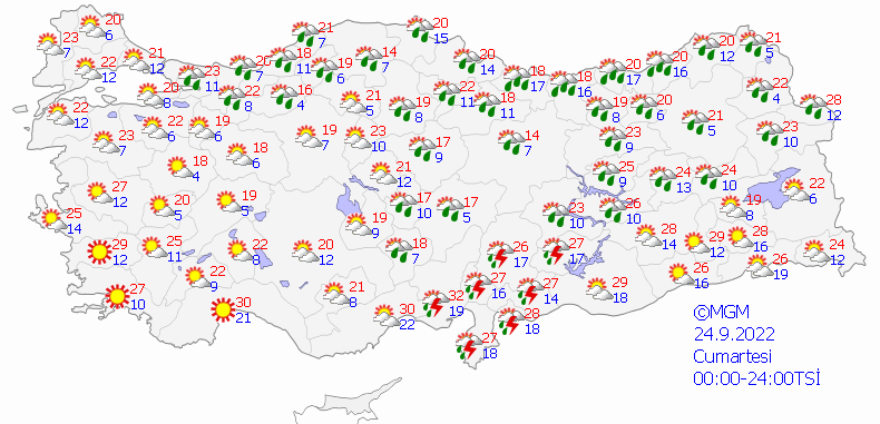 Meteoroloji Genel Müdürlüğü tarafından yapılan son değerlendirmelere göre: Ülkemizin kuzey, iç ve doğu kesimlerinin parçalı ve yer yer çok bulutlu, Marmara'nın kuzey ve doğusu, Doğu Akdeniz, İç Anadolu'nun güney ve doğusu, Karadeniz, Doğu Anadolu'nun kuzey ve batısı ile Antalya, Bitlis. Muş, Hakkari, Van'ın doğusu, Gaziantep, Kilis ve Adıyaman çevrelerinin yerel olmak üzere aralıklı sağanak ve yer yer gök gürültülü sağanak yağışlı, diğer yerlerin az bulutlu ve açık geçeceği tahmin ediliyor. Yağışların; Osmaniye, K. Maraş'ın batısı ile zamanla Doğu Karadeniz kıyıları ile Ordu çevrelerinde yer yer kuvvetli olması bekleniyor. kesimlerinde yerel kuvvetli olması bekleniyor.