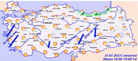 Meteoroloji hava durumuna göre rüzgar, genellikle kuzey, Akdeniz kıyıları ile güneydoğu kesimlerde batı ve güneybatı yönlerden hafif, ara sıra orta kuvvette, Marmara’nın güneybatısı ve Kıyı Ege ile Doğu Anadolu’nun batısında kuzey yönlerden kuvvetlice (30-50 km/sa, yer yer 40-60 km/saat)) esmesi bekleniyor.