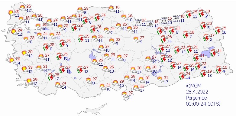Meteoroloji Genel Müdürlüğü tarafından yapılan son değerlendirmelere göre: Ülkemizin iç ve doğu kesimlerinin parçalı, yer yer çok bulutlu, İç Ege'nin doğusu, Göller Yöresi, İç Anadolu’nun batısı, Batı ve Doğu Karadeniz’in iç kesimleri ve (Malatya hariç) Doğu Anadolu ile Güneydoğu Anadolu’nun doğusunun yerel sağanak ve gök gürültülü sağanak yağışlı, diğer yerlerin az bulutlu ve açık geçeceği tahmin ediliyor. Sabah ve gece saatlerinde Marmara kıyıları ile Karadeniz kıyılarında yer yer pus ve sis bekleniyor. Güneydoğu Anadolu'nun güneyinde toz taşınımı görüleceği tahmin ediliyor.