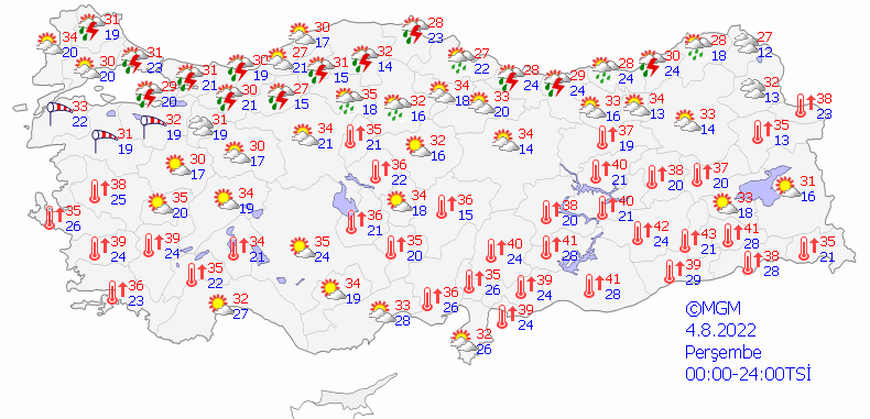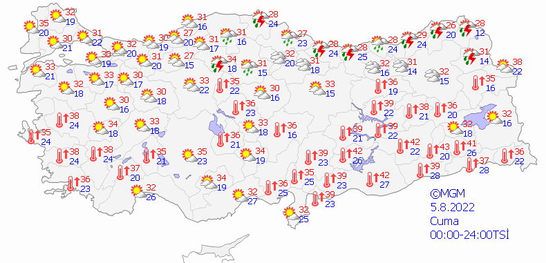 Meteoroloji Genel Müdürlüğü tarafından yapılan son değerlendirmelere göre: Ülkemizin kuzey kesimleri ile Akdeniz’in iç kesimlerinin parçalı ve yer yer çok bulutlu, Batı Karadeniz’in iç kesimleri, Orta ve Doğu Karadeniz kıyıları, Kırklareli, İstanbul, Kocaeli, Sakarya, Yalova ve Sinop çevreleri, Balıkesir’in kuzey, Düzce’nin ve Kastamonu’nun kıyı kesimleri ile Batı Akdeniz’in Toroslar kesiminin yerel olmak üzere sağanak ve gök gürültülü sağanak yağışlı, diğer yerlerin az bulutlu ve açık geçeceği tahmin ediliyor.
