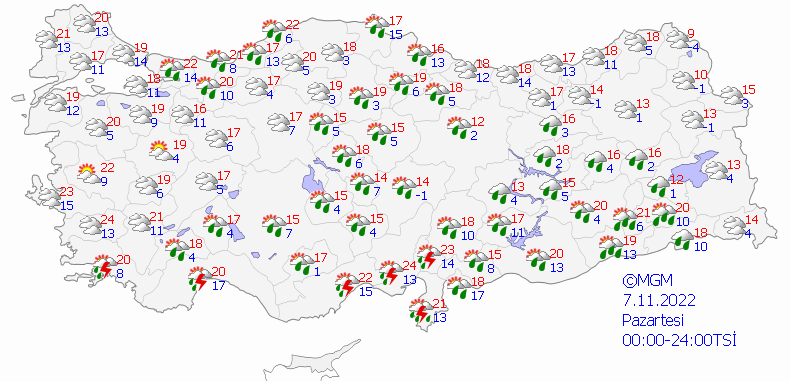Meteoroloji Genel Müdürlüğü tarafından yapılan son değerlendirmelere göre: Ülkemizin genelinin parçalı ve yer yer çok bulutlu, Akdeniz, İç Anadolu (Ankara'nın kuzeyi, Çankırı ve Eskişehir hariç), Doğu Anadolu’nun batısı, Güneydoğu Anadolu'nun batısı ile Kırklareli'nin kuzey kesimleri, İstanbul’un kuzey ilçeleri, Kocaeli, Sakarya, Çanakkale’nin doğu, Balıkesir’in kuzey kesimleri, İzmir, Muğla, Denizli, Düzce ve Mardin çevrelerinin yağışlı geçeceği tahmin ediliyor. Genellikle yağmur ve sağanak, Akdeniz kıyı kesimlerinde gök gürültülü sağanak, Sivas, Tunceli, Erzincan ve Bingöl’un yüksek kesimlerinde karla karışık yağmur ve yer yer kar şeklinde olması beklenen yağışların, Adana’nın güneyi, Hatay çevreleri ile bu akşam saatlerinde Antalya'nın doğusunda yerel olmak üzere kuvvetli olması bekleniyor.