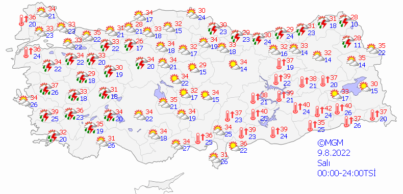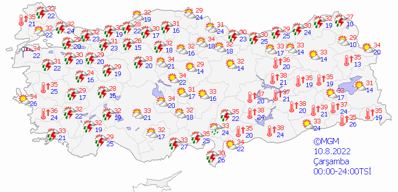 Meteoroloji Genel Müdürlüğü tarafından yapılan son değerlendirmelere göre: Ülkemizin kuzey, iç ve batı kesimlerinin parçalı ve yer yer çok bulutlu, İç Ege, Akdeniz’in iç kesimleri, Orta ve Doğu Karadeniz kıyıları, Balıkesir, Bursa, Sakarya, Bilecik, Eskişehir, Ankara, Bolu, Kars ve Ardahan çevreleri ile Erzurum'un kuzey ilçelerinin yerel olmak üzere sağanak ve gök gürültülü sağanak yağışlı, diğer yerlerin az bulutlu ve açık geçeceği tahmin ediliyor. Yağışların; İç Ege ve Göller yöresinde yerel olmak üzere kuvvetli olması bekleniyor. Rüzgarın; Marmara ile Kuzey Ege kıyılarında kuzey ve kuzeydoğu yönlerden yer yer kuvvetli (40-60 km/saat) olarak eseceği tahmin ediliyor.