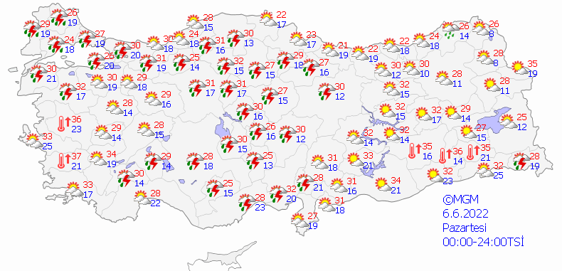 Meteoroloji Genel Müdürlüğü tarafından yapılan son değerlendirmelere göre: Ülkemizin kuzey, iç ve batı kesimlerinin parçalı ve yer yer çok bulutlu, Pazar akşam saatlerinde Trakya Kesimi, Batı Akdeniz, (Eskişehir ve Sivas hariç) İç Anadolu ile pazartesi öğle saatlerinden sonra (Bursa ve Bilecik hariç) Marmara, İç Anadolu'nun güney ve doğusu, Göller Yöresi, (Gümüşhane ve Bayburt hariç) Karadeniz’in iç kesimleri, Çankırı ve Hakkâri çevreleri ile Ankara'nın kuzey ilçelerinin yerel sağanak ve gök gürültülü sağanak yağışlı, diğer yerlerin az bulutlu ve açık geçeceği tahmin ediliyor. Yağışların, pazar akşamın ilk saatler ile pazartesi öğle saatlerinden itibaren Edirne, Kırklareli ve Tekirdağ çevrelerinde kuvvetli olması bekleniyor. Güneydoğu Anadolu’da toz taşınımı bekleniyor.
