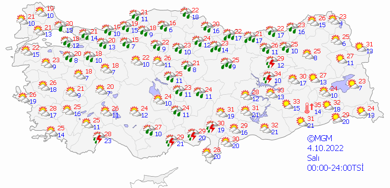 Meteoroloji Genel Müdürlüğü tarafından yapılan son değerlendirmelere göre: Ülkemizin kuzey, iç ve güneybatı kesimlerinin parçalı ve yer yer çok bulutlu, Marmara ve İç Anadolu'nun doğusu, Karadeniz ile Antalya, Mersin, Adana, Karaman, Çankırı ve Erzincan çevrelerinin sağanak ve gök gürültülü sağanak yağışlı, diğer yerlerin az bulutlu ve açık geçeceği tahmin ediliyor. Yağışların; Ordu ve Tokat çevreleri ile Yozgat'ın doğu, Sivas'ın kuzey ve batı çevrelerinde yerel kuvvetli olması bekleniyor.