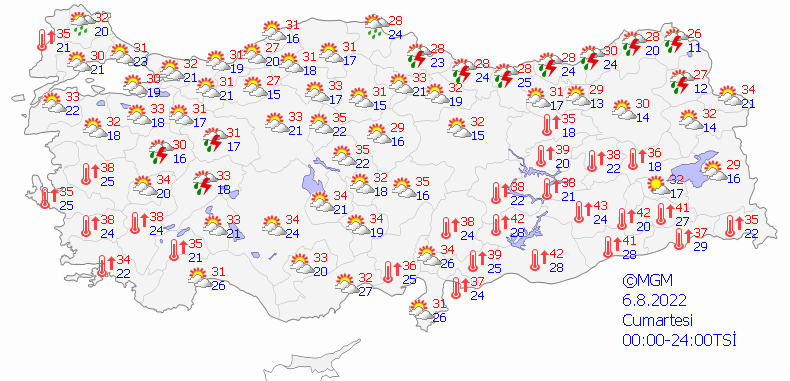 Meteoroloji Genel Müdürlüğü tarafından yapılan son değerlendirmelere göre: Ülkemizin kuzey kesimlerinin parçalı, yer yer çok bulutlu, Batı Karadeniz’in iç kesimleri ve Sinop, Orta ve Doğu Karadeniz kıyıları, İç Anadolu'nun kuzeybatısı ile Doğu Anadolu'nun kuzeydoğusunun yerel sağanak ve gök gürültülü sağanak yağışlı, diğer yerlerin az bulutlu ve açık geçeceği tahmin ediliyor.