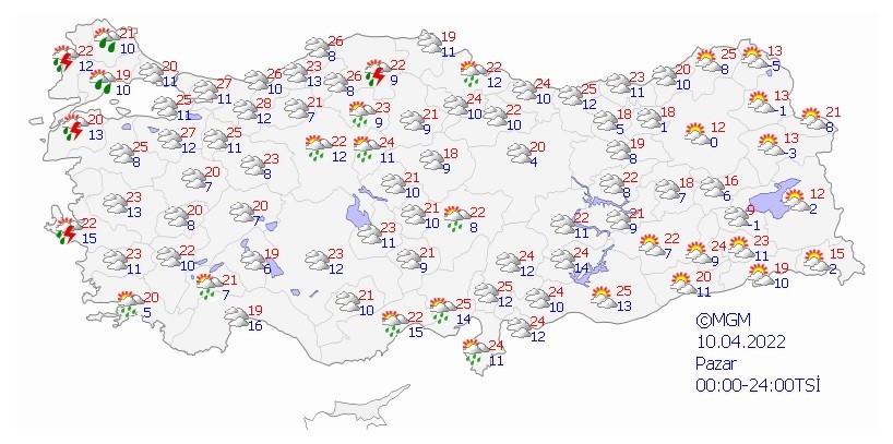 Meteoroloji Genel Müdürlüğü tarafından yapılan son değerlendirmelere göre: Ülkemiz genelinin parçalı, yer yer çok bulutlu, bu sabah ve öğle saatlerinde Ankara, Kırıkkale, Çankırı, Kastamonu, Tokat, Kayseri, Mersin, Adana ve Osmaniye çevreleri ile Samsun ve Sinop'un iç kesimlerinin, Karabük ve Yozgat'ın doğu, Sivas'ın batı çevrelerinin; akşam saatlerinden sonra (Bilecik hariç) Marmara ve Kıyı Ege'nin kuzey kesimleri ile Antalya ve Isparta çevrelerinin yerel sağanak, yer yer gök gürültülü sağanak yağışlı geçeceği tahmin ediliyor. Karadeniz'in iç ve yüksek kesimleri ile Doğu Anadolu'da yüksek kar örtüsüne sahip eğimli bölgelerde çığ riski bulunmaktadır.