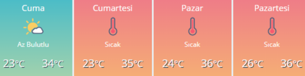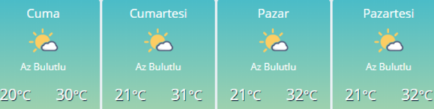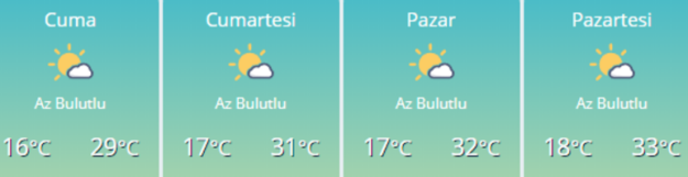 Az bulutlu ve açık, iç kesimlerinin yer yer parçalı bulutlu geçeceği tahmin ediliyor. Rüzgarın; öğle saatlerinden itibaren kıyı kesimlerde kuzey ve kuzeydoğu yönlerden kuvvetli olarak (40-60 km/saat) esmesi bekleniyor.