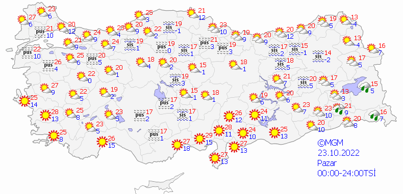 Az bulutlu ve açık, geçeceği tahmin ediliyor. Bu sabah ve gece saatlerinde doğu kesimlerinde yer yer sis ve pus hadisesi bekleniyor.
