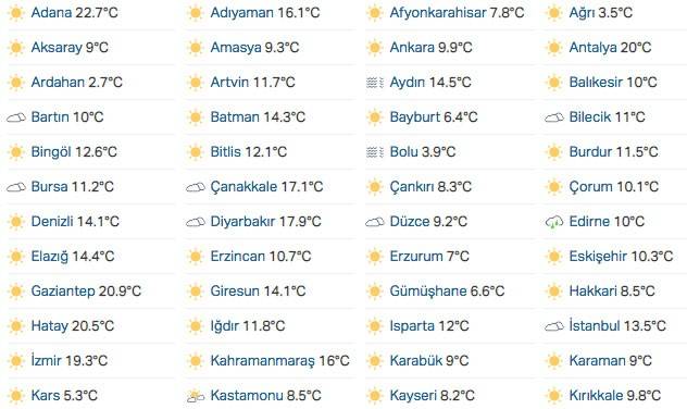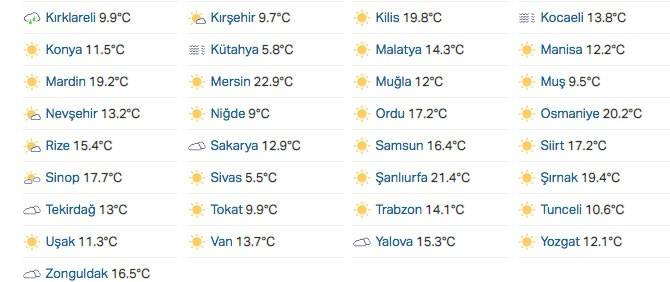 Hava sıcaklığının Marmara Bölgesi'nde mevsim normallerinin 1-3 derece altında, Ege ve iç kesimlerde 2-4 derece üzerinde, diğer yerlerde mevsim normalleri civarında seyredeceği tahmin ediliyor. Rüzgarın, genellikle kuzeyli, Güneydoğu Anadolu ve Doğu Anadolu'da güneybatılı yönlerden hafif, ara sıra orta kuvvette, Marmara Bölgesi, Kuzey Ege ve Karadeniz kıyılarında kuzeyli yönlerden kuvvetli ve yer yer kısa süreli fırtına şeklinde eseceği öngörülüyor.