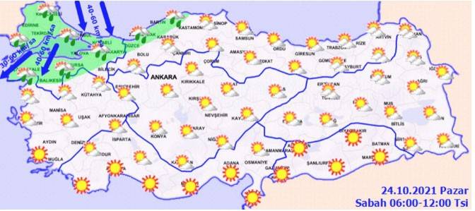 Meteoroloji Genel Müdürlüğünden yapılan uyarıya göre, bugün ülkenin kuzey, iç ve batı kesimleri parçalı ve yer yer çok bulutlu olacak. Marmara ve Karadeniz bölgesi ile Kütahya, Eskişehir, Çankırı, Yozgat, Sivas ve Ardahan çevrelerinin yağışlı geçeceği tahmin ediliyor.