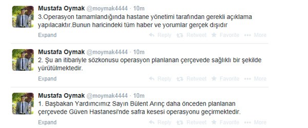 Arınç'ın geçirdiği ameliyatın ayrıntılarını danışmanı Mustafa Oymak, Twitter'dan attığı mesajlarla da duyurdu.