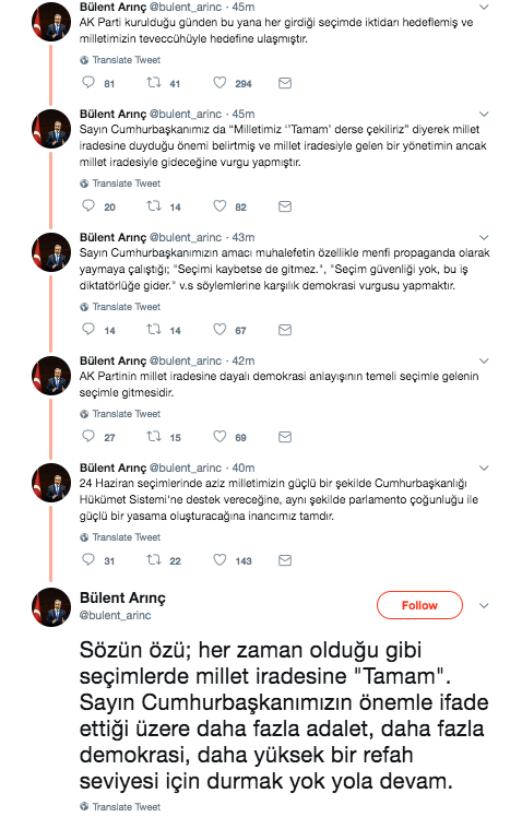 Meclis Eski Başkanı Bülent Arınç, paylaşımlarını "Sözün özü; her zaman olduğu gibi seçimlerde millet iradesine 'Tamam'" diyen Arınç, "Sayın Cumhurbaşkanımızın önemle ifade ettiği üzere daha fazla adalet, daha fazla demokrasi, daha yüksek bir refah seviyesi için durmak yok yola devam" diyerek tamamladı.
