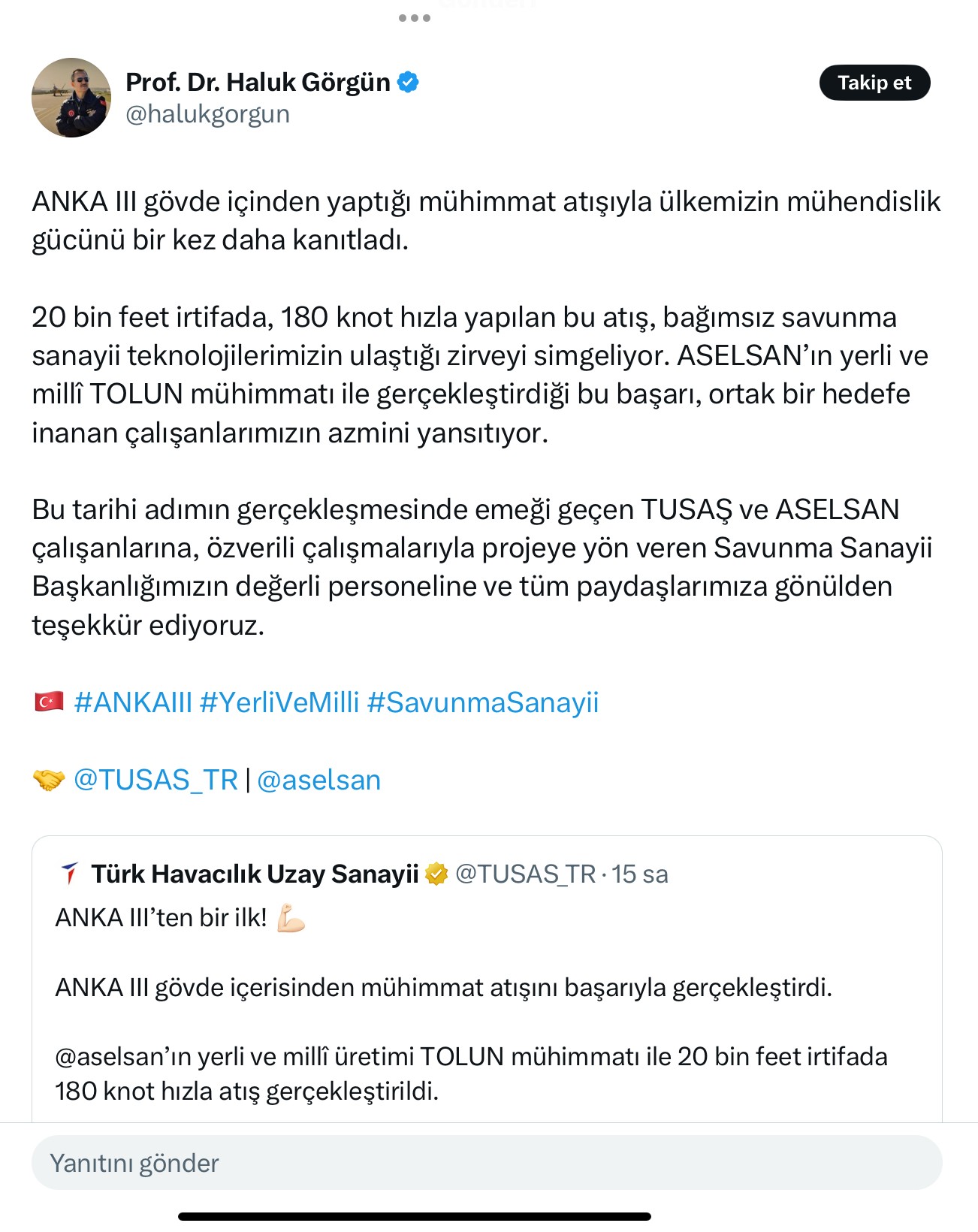 Cumhurbaşkanlığı Savunma Sanayii Başkanı Haluk Görgün, sosyal medya hesabından ANKA III'ün başarısını şu sözlerle paylaştı: