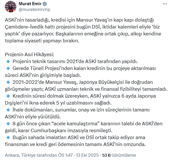 “Projenin Asıl Hikâyesi” diyerek bazı detaylar paylaşan Murat Emir, “Projenin teknik tasarımı 2021’de ASKİ tarafından yapıldı. Gerede Tüneli Projesi’nden kalan kredinin bu projeye aktarılması süreci ASKİ’nin girişimiyle başladı. 2021–2022’de Mansur Yavaş, Japonya Büyükelçisi ile doğrudan görüşmeler yaptı; ASKİ uzmanları teknik ve finansal fizibiliteyi tamamladı. Kredinin süresi dolmak üzereyken, ASKİ yalnızca 6 ayda Japonya Dışişleri’ni ikna ederek 5 yıl uzatılmasını sağladı. İhale dokümanları, sunumlar, onay ve izin süreçlerinin tamamı ASKİ’nin eliyle yürütüldü. 8 gün önce çıkan “acele kamulaştırma” kararının talebi de ASKİ’den geldi, karar Cumhurbaşkanı imzasıyla resmileşti. Bugün sahada imalatları ASKİ ve DSİ ortak takip ediyor ama finansman ve kredi geri ödemesinin tamamı ASKİ’nin omzunda” ifadelerine yer verdi.