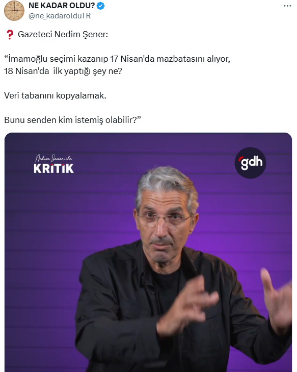 İstanbul Cumhuriyet Başsavcılığı’nca yürütülen casusluk soruşturmasını değerlendiren Nedim Şener: “İmamoğlu seçimi kazanıp 17 Nisan'da mazbatasını alıyor, 18 Nisan’da ilk yaptığı şey ne? Veri tabanını kopyalamak. Bunu senden kim istemiş olabilir?” dedi.