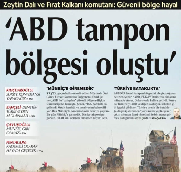 Geçen hafta YAŞ’ta emekli olmasına karar verilen Müşterek Özel Görev Komutanı Tuğgeneral Erdal Şener, ABD ile uzlaşılan güvenli bölgeye ilişkin Cumhuriyet paçavrasına röportaj verdi. “TSK harekatı engellendi” diyen Şener, “Ortak harekat ve devriyeden bahsediliyor. Ben Münbiç’te Amerikalılarla devriye yaptım. Bir gün Münbiç’e girmedik. Dostlar alışverişte görsün. 30-40 km derinlik tamamen hayal” dedi. Aynı zamanda Türkiye’nin dış politikasını eleştirip hükümet yetkilileri hakkında hadsiz ifadeler kullanan Şener, çıkış yolunun yüz binlerce sivilin katili Esed ile görüşmek olduğunu savundu.