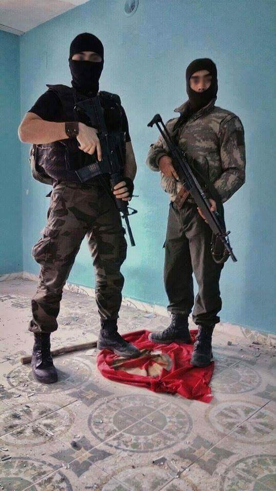 "Evet arkadaşlar gördüğünüz gibi bir kaç tane şerefsiz şöyle bir çaput yapmış neymiş bu bayrakmış,neymiş kürdistan istiyorlarmış, bir kere senin bir vatanın olması için önce namusunun olması lazım, senin bir bayrağının olması için, ilk önce şerefin kanın olması lazım. Senin bu ülkede başka bir toprak kurman için, başka bir vatan yapman için ilk önce bizim ölmemiz lazım, senin bayrak diye gezdirdiğini biz böyle ısınmak için yakarız arkadaş, varsa bir sıkıntın gelir adam gibi karşımıza çıkarsın..."