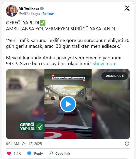 İçişleri Bakanı Ali Yerlikaya, sosyal medya hesabından bir paylaşım yaparak yeni Trafik Kanunu Teklifi'ne göre geçiş üstünlüğü olan ambulans ve itfaiyeye yol vermeyenlerin sürücü belgesine 30 gün süreyle el konulacağını, araçlarının da 30 gün trafikten men edileceğini belirtti.