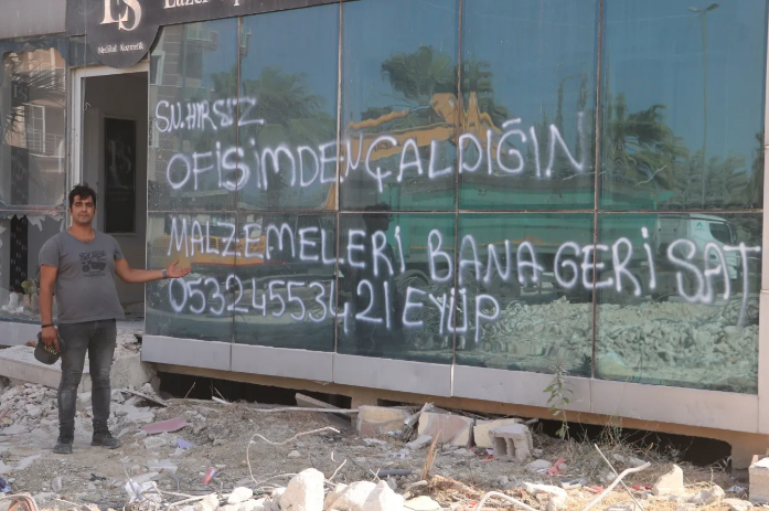 Hatay’da, enkaz halindeki iş yerinden 600 bin TL değerindeki eşyaları ve çekleri çalınan Eyüp Özbek, "Sayın hırsız, ofisimden çaldığın malzemeleri bana geri sat" yazısıyla hırsızlara seslendi.