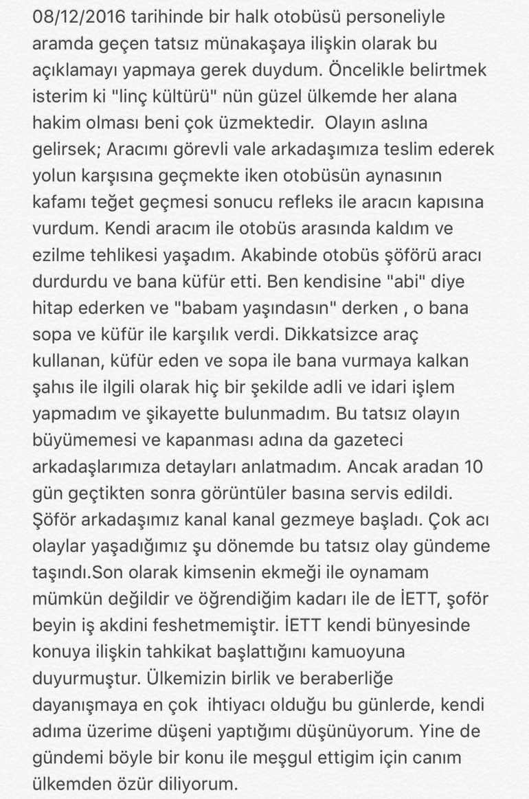 "08.12.2016 tarihinde bir halk otobüsü personeliyle aramda geçen tatsız münakaşaya ilişkin olarak bu açıklamayı yapmaya gerek duydum.