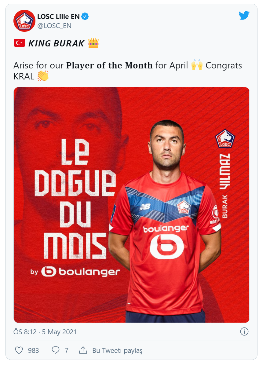 Lille kulübünden yapılan açıklamaya göre, taraftarların oylarıyla belirlenen ayın futbolcusu ödülünün nisan ayındaki kazananı Burak Yılmaz oldu.