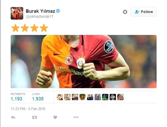 Beijing yolundaki Burak Yılmaz, kendisine ait twitter hesabından 4 yıldız paylaşımı yaptı.
