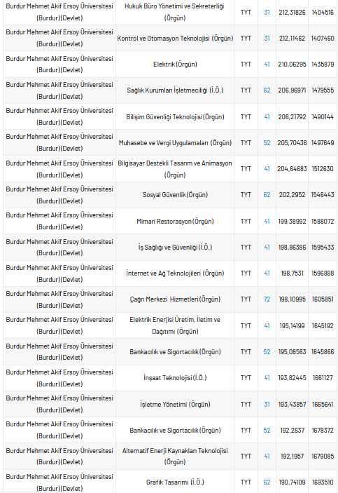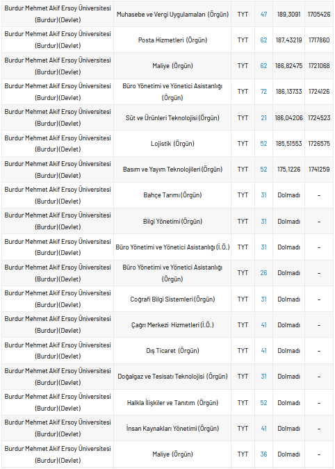 Mehmet Akif Ersoy Üniversitesi 2 yıllık taban puanları 2021, yüzdelik dilimleri ve kontenjan sayıları kaçtır?
