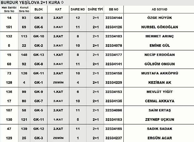 TOKİ Burdur Yeşilova sonuçları: Burdur Yeşilova konut kura sonuçları başvuru yapan hak sahipleri tarafından merak ediliyor. Yeşilova TOKİ 2+1 164 ve 3+1 72 konutlar için hak sahipleri çekilen koru sonucu neticesinde belli oldu. TOKİ Burdur Yeşilova kura çekiliş sonuçları isim listesi başvuruda bulunanlar tarafından merak ediliyor. İşte Burdur Yeşilova TOKİ sonuçları isim listesi.