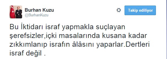 T.B.M.M. Anayasa Komisyonu Başkanı ve İstanbul Ak Parti Milletvekili Burhan Kuzu, iktidara yönelik israf eleştirilerini twitter hesabından sert bir şekilde cevapladı. İSraf eleştirilerini yapanları şerefsizlikle itham eden Kuzu, içki masalarında kusana kadar israf yaptıklarını belirtti.