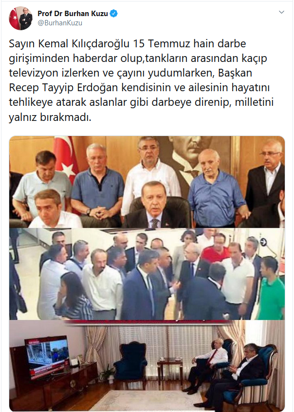 Kılıçdaroğlu’nun 15 Temmuz hain darbe girişimi sırasında darbeci teröristlerin yanından kaçışını ve evden TV izlediği fotoğrafı paylaşan Kuzu, Cumhurbaşkanı Erdoğan’ın da darbe girişimi sırasında devlet kurumlarını yönlendirdiği anın görüntüsünü yayınladı.