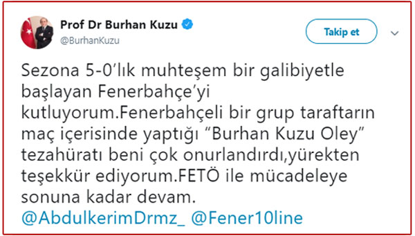 Sezona 5-0’lık muhteşem bir galibiyetle başlayan Fenerbahçe’yi kutluyorum. Fenerbahçeli bir grup taraftarın maç içerisinde yaptığı “Burhan Kuzu Oley” tezahüratı beni çok onurlandırdı, yürekten teşekkür ediyorum. FETÖ ile mücadeleye sonuna kadar devam.