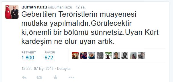 "Gebertilen teröristlerin muayenesi mutlaka yapılmalıdır" mesajını paylaşan Kuzu, "Görülecektir ki, önemli bir bölümü sünnetsiz" ifadesini kullandı.