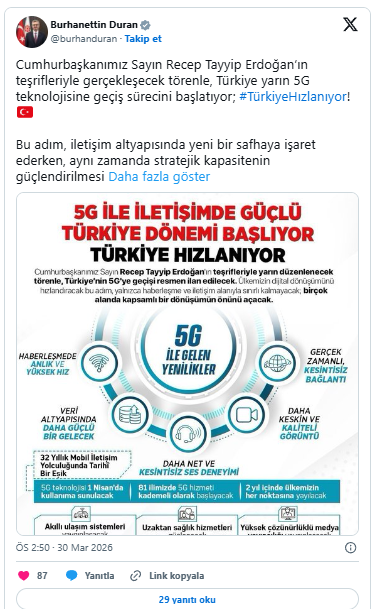 Duran, sosyal medya hesabından Türkiye'nin 5G'ye geçişiyle ilgili paylaşımda bulundu.