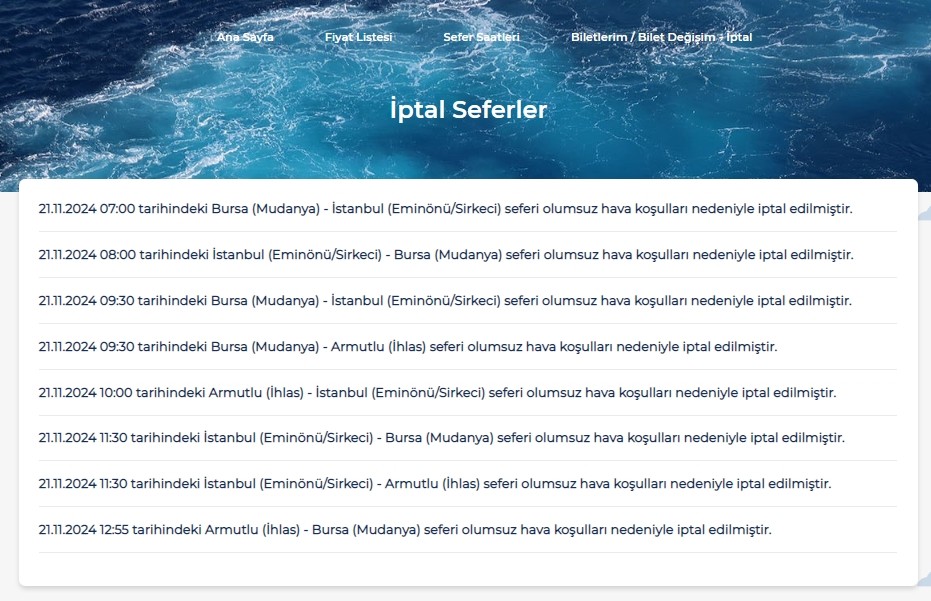 BUDO'dan yapılan duyuruda, 07.00 ile 12.55 saatleri arasında yapılması planlanan Bursa (Mudanya) - İstanbul (Eminönü/Sirkeci), İstanbul (Eminönü/Sirkeci) - Bursa (Mudanya), Bursa (Mudanya) - İstanbul (Eminönü/Sirkeci), Bursa (Mudanya) - Armutlu (İhlas), Armutlu (İhlas) - İstanbul (Eminönü/Sirkeci),İstanbul (Eminönü/Sirkeci) - Bursa (Mudanya), İstanbul (Eminönü/Sirkeci) - Armutlu (İhlas), Armutlu (İhlas) - Bursa (Mudanya) olmak üzere karşılıklı 8 deniz otobüsü seferinin iptal edildiği belirtildi. (DHA)