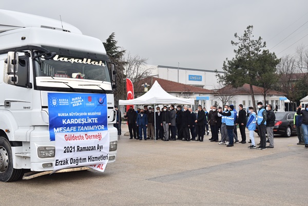 Bursa Büyükşehir Belediyesi’nin destekleriyle Güldeste Derneği ve Kevser Eğitim Vakfı tarafından hazırlanan 3 Tır dolusu Ramazan erzak paketi, Büyükşehir Belediyesi’nin kardeş kentleri Ağrı, Muş ve Bitlis’e gönderildi.