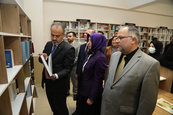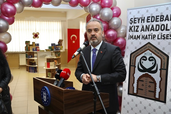Şeyh Edebali Kız Anadolu İmam Hatip Lisesi’ne kazandırılan kütüphanenin açılışında konuşan Başkan Alinur Aktaş, Büyükşehir Belediyesi tarafından düzenlenen Kitap Fuar’ına Bursa’da öğrencilerin yoğun ilgi gösterdiğini hatırlattı. Bursa’da kitaba karşı büyük bir ilgi ve alaka olduğunu söyleyen Başkan Aktaş, Cumhurbaşkanı Recep Tayyip Erdoğan’ın eşi Emine Erdoğan’ın himayelerinde Milli Eğitim Bakanlığı tarafından hayata geçirilen Kütüphanesiz Okul Kalmayacak Projesi’ne 1 milyon TL’lik kitap bağışında bulunma sözü verdiklerini belirtti. Bu kapsamda 40 bin adet kitap temin ettiklerini ifade eden Başkan Aktaş, “Bazı okullarda hayata geçirdiğimiz kütüphaneleri de Kütüphaneler Haftası’nda hizmete alıyoruz. Kitaplar vitrinleri süsleyen nesne değildir. Açıp okumak gerekir. Kitaplarla kendimizi donatmalıyız. Kitaplarla aramıza mesafe koymamalıyız. Kitap okumaktan asla vazgeçmeyin. Kitap okuyan kendini daha iyi ifade eder. Daha huzurlu, insani ilişkileri kuvvetli, hayata karşı güçlü olur. Tavsiyem, kitapsız yaşamayalım. Kitapsız yaşamak, kör, sağır ve dilsiz yaşamak gibidir. Kitaplarla iç içe olalım. Okulda oluşturduğumuz kütüphaneyi öğrencilerimizin en iyi şekilde kullanmasını arzuluyoruz” dedi.