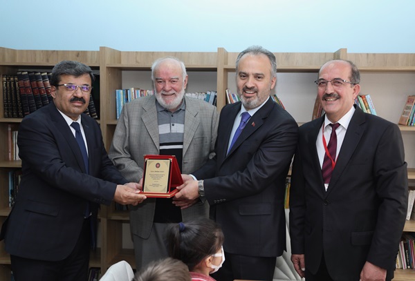 Bursa Büyükşehir Belediye Başkanı Alinur Aktaş, 58. Kütüphane Haftası kapsamında kitap bağışında bulunulan Şeyh Edebali Kız Anadolu İmam Hatip Lisesi’ni ziyaret etti. Büyükşehir Belediyesi’nin katkılarıyla oluşturulan kütüphane kurdele kesimiyle öğrencilerin hizmetine sunuldu. Başkan Alinur Aktaş, daha sonra Balabanbey Dörtçelik İlkokulu’nu ziyaret ederek Büyükşehir Belediyesi tarafından yaptrılan kütüphaneyi ziyaret etti. Öğrencilerle sohbet ederek birlikte kitap okuyan Başkan Aktaş, kütüphaneye kitap takviyesinde bulunma sözü de verdi. Kütüphanenin oluşturulmasında emeği geçen Büyükşehir Belediye Başkanı Alinur Aktaş’a ve hayırsever Burhan Alıcı’ya plaket takdim edildi. Başkan Aktaş, öğrencilere de satranç takımı ve mangala seti hediye etti.