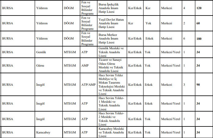 Bursa liseleri taban puanı 2021 Bursa liseleri kontenjanları, Bursa liseleri başarı sıralaması