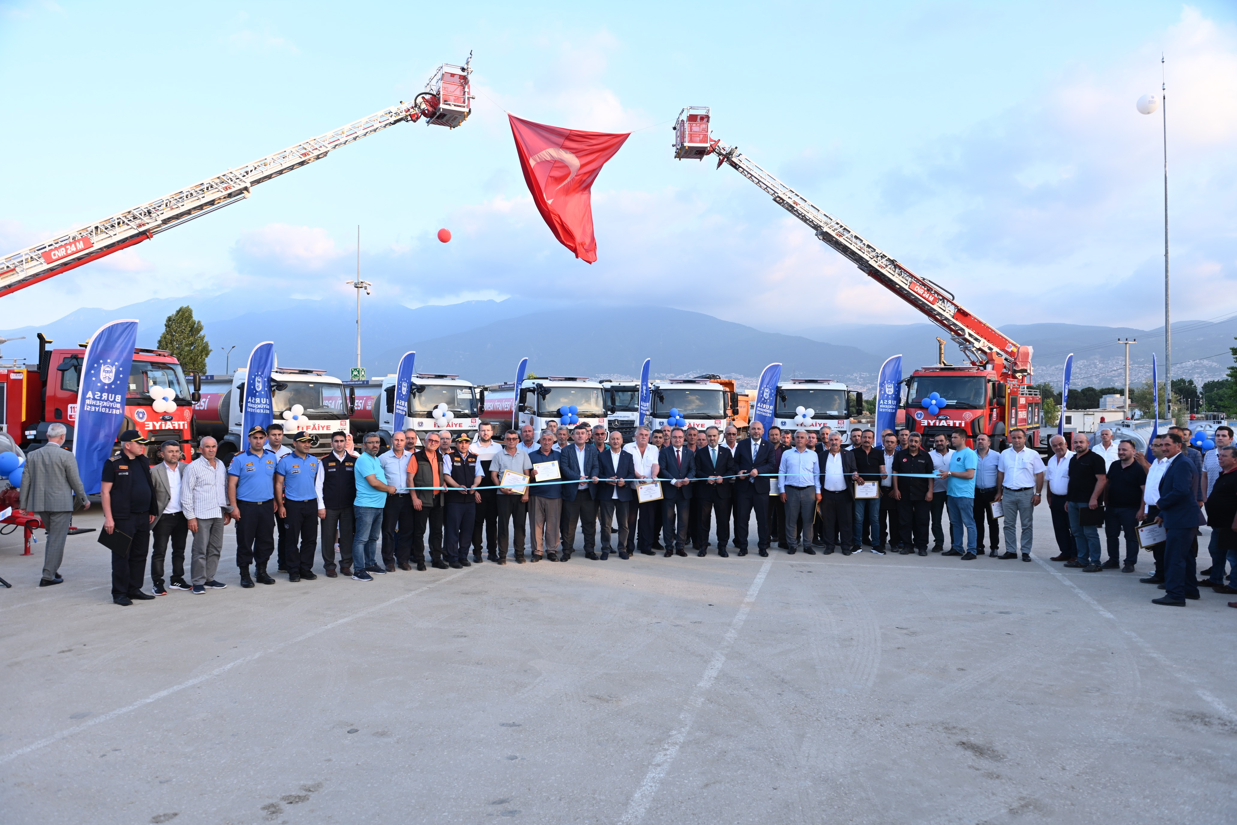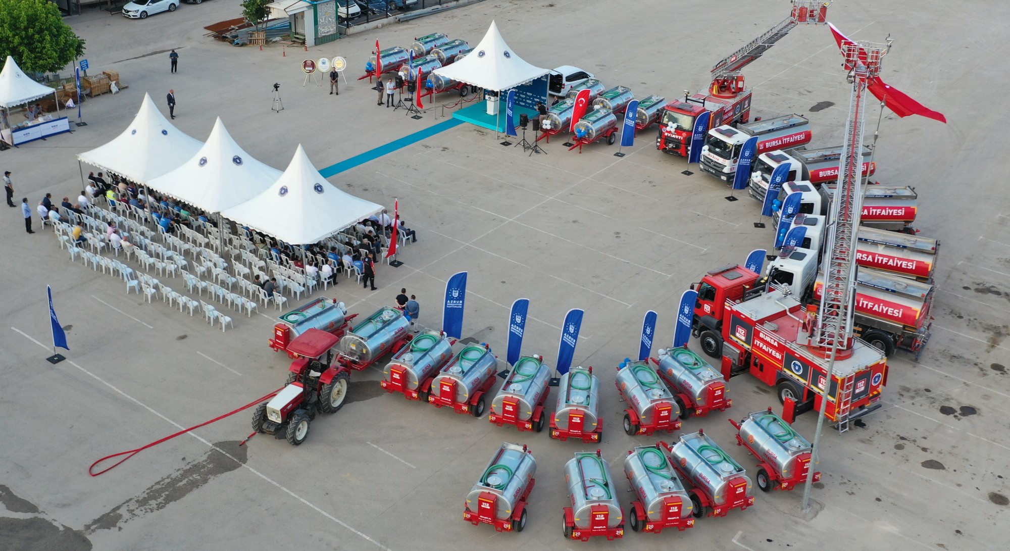 Bursa Büyükşehir Belediyesi halkın can ve mal güvenliğini doğrudan ilgilendiren en önemli hizmetlerden biri olan itfaiye teşkilatını her geçen gün güçlendiriyor. Son olarak, özellikle kırsal mahallelerde olası yangınlara müdahale için alınan 25 adet traktör arkası yangın söndürme su tankeri ile ikisi merdivenli 7 itfaiye aracı daha hizmet filosuna dahil edildi.