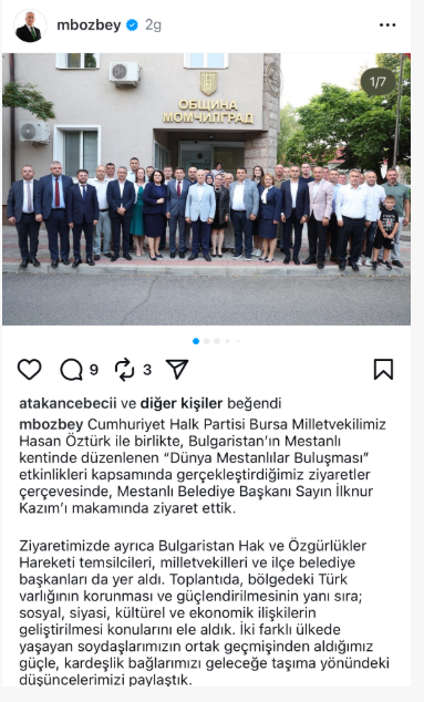 CHP Bursa Milletvekili Hasan Öztürk ile birlikte Bulgaristan’ın Mestanlı kentinde düzenlenen “Dünya Mestanlılar Buluşması” etkinliklerine katılan Bozbey, Mestanlı Belediye Başkanı İlknur Kazım’ı makamında ziyaret etti. Ziyaretten fotoğraflar paylaşan Bozbey’in, yangın felaketi sırasında düne kadar yurt dışında olması, “Kriz anında liderlik nerede?” sorusunu gündeme taşıdı.