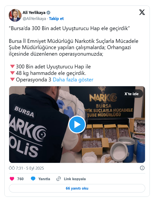 "Operasyonda 3 şüpheliyi yakaladık. 2'si tutuklandı, 1'i hakkında adli kontrol hükümleri uygulandı. Bursa Valimizi, Bursa Cumhuriyet Başsavcılığımızı, EGM Narkotik Suçlarla Mücadele Başkanlığımızı, Bursa İl Emniyet Müdürümüzü ve polislerimizi tebrik ediyorum. Gençlerimizin geleceğini ve hayallerini zehir tacirlerine teslim etmeyeceğiz."