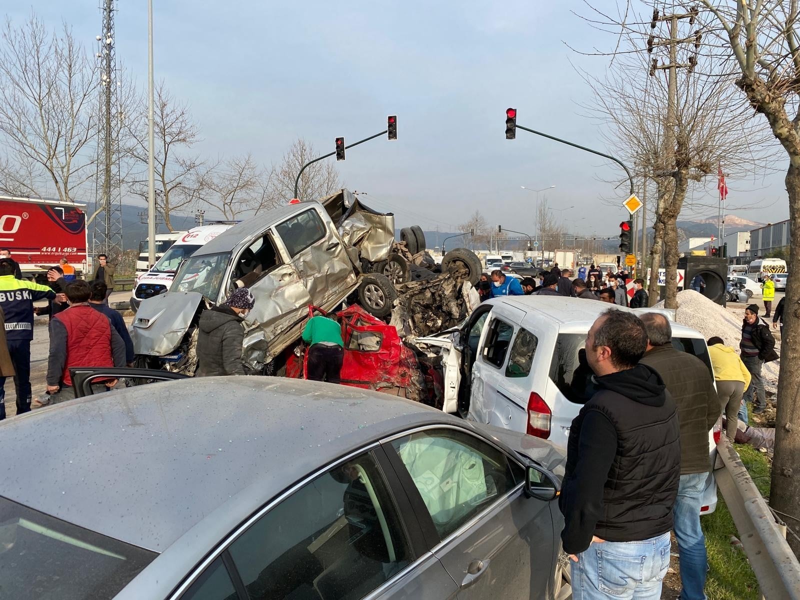 Bursa'nın Kestel ilçesinde freni boşalan tırın, önüne gelen aracı ezdiği ve 3 kişinin hayatını kaybettiği 21 kişinin de yaralandığı feci kazanın ardından, savaş alanına dönen alan havadan görüntülendi.